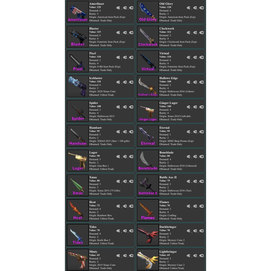 Mm2 Value List Roblox Murder Mystery 2 List from i.ytimg.com Check spelling or type a new query. Maybe you would like to learn more about one of these? We did not find results for: